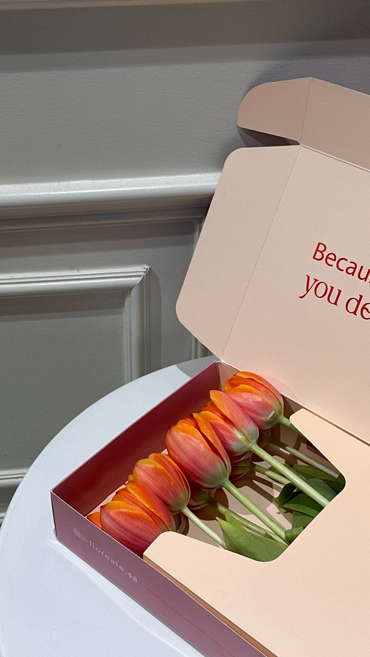 أهدي من تحب لحظة مميزة مع بوكس أنيق يحتوي على ( 10 اغصان توليب طبيعي ) مختار بعناية، يزينه كرت أنيق لكتابة كلماتكالخاصة.